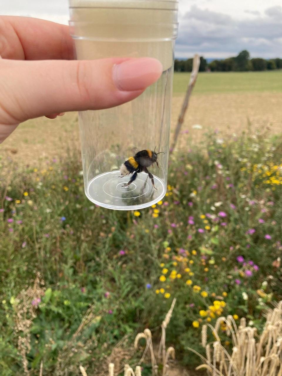 Fasziniert schauen die Schülerinnen und Schüler auf den blühenden Feldrain bei Mühlhausen. Er wurde mit Unterstützung der Stadt Mühlhausen realisiert und nun untersuchen sie dort die Flora und Fauna. So lernen sie die Bedeutung der biologischen Vielfalt kennen. Mit der Übernahme der Patenschaft werden die Schülerinnen und Schüler der Evangelischen Grundschule Mühlhausen den Feldrain pflegen, die Tier- und Pflanzenwelt unter die Lupe nehmen und mehrmals im Jahr unter fachlicher Anleitung ein Schmetterlingsmonitoring durchführen. Heute war die Burgklasse des 4. Jahrgangs zum ersten Mal gemeinsam mit Projektleiter Marcel Komischke am Feldrain.